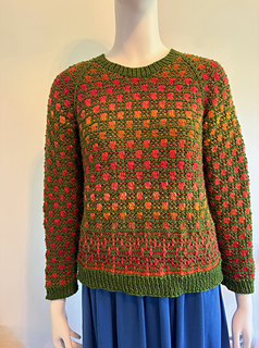 This is a great choice if you don’t have enough yarn in one color for a whole sweater, since the 2-row stripe mosaic construction allows for using less than a full sweater’s worth of yarn in one color as you pair it with another color.