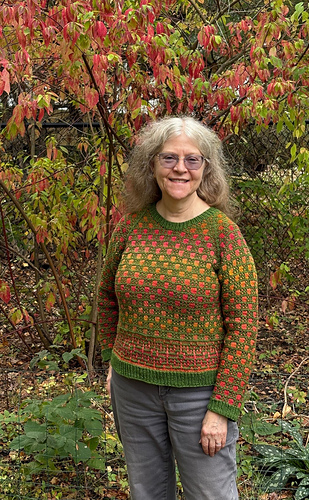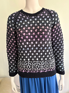 Windows on The Garden is a top-down, seamless, mosaic-patterned raglan pullover, worked in 2 DK-weight yarns. It is an easily-memorized mosaic stitch pattern and lots of fun to watch the color-changing yarn appear in the “windows” as you knit. Choose one solid yarn for the frame and one colorful yarn for the windows.
