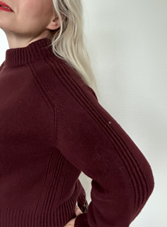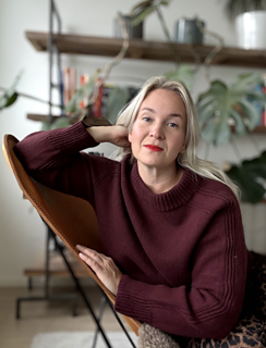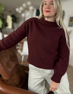 Mallineule: 8 (10, 11, 11, 12) (14, 15, 16, 18) kerää Knitting for Oliven Merinoa (100 % merino, 50 g / 250 m) sävyssä Bordeaux, neulottu kaksinkertaisella langalla (lankamäärä on laskettu tähän kokonaisuudessaan fingering-vahvuiselle langalle).