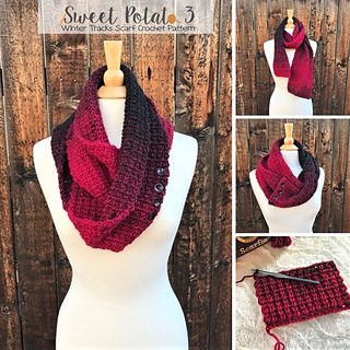 The Winter Tracks Scarf is made in a unique and quick stitch pattern that resembles tracks in the snow. Adding buttons will allow you to wear the scarf as a cowl or a scarf, the versatility will be loved!