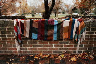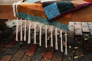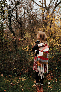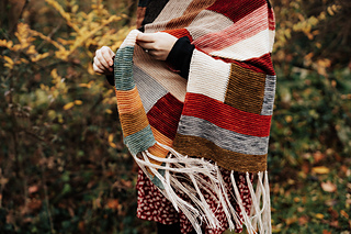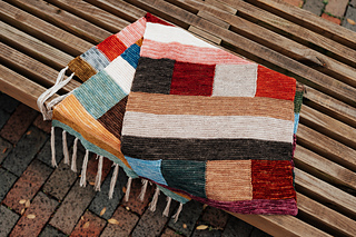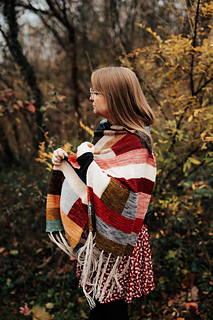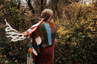 Long rectangular wrap knit from end to end. Knit flat, worked in sections of garter stitch ribbon stripes and modular patches to represent quilts and traditional handcraft and costuming.