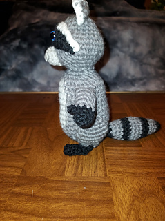 I used a cheap worsted-weight yarn to make this little guy, he stands about 7 inches tall and is about 3 1/2 inches wide. If you’d like a smaller or larger raccoon, you only have to choose a lighter weight of yarn and corresponding hooks.