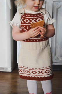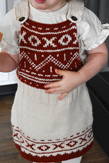 The XO Toddler Christmas Dress knitting pattern is a great choice for someone looking to knit a festive heirloom outfit for their little one. The body is worked top-down, starting with the front panel decorated with two-color stranded colorwork.