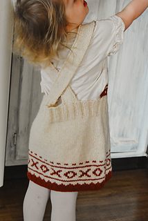 Back stitches are cast on at the waist, and the skirt portion is knitted in the round until you reach your desired length. Then you pick up stitches on the backside for two straps, crossed at the back, and connected with two buttons at the front panel.