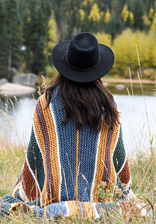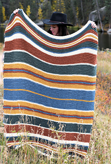 The Yellowstone Throw Blanket is a striped blanket made with two skeins each of Lion Brand Hue + Me yarn in the following colors: Juniper, Denim, Saffron, Mustard, and Salt. Using 40” size 15 circular knitting needles, the pattern produces a 47” x 53” lapghan.