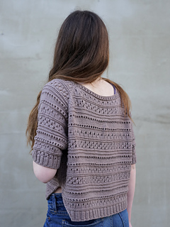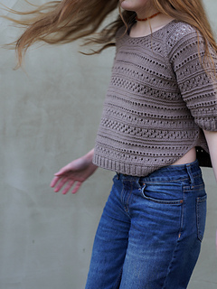 The Yoga Summer sweater is a short-length knit from the Yoga sweater collection, which also includes the Yoga Winter sweater and the Mohair Yoga sweater. This design continues the Yoga story and is not the last sweater in the collection. It is worked from the top down with raglan shaping using M1L and M1R increases. The entire sweater is worked in a delicate textured pattern that gives the fabric a light and airy feel. The neckline has no ribbing, which adds an extra sense of lightness that feels especially right for the warmer season. The short sleeves gently narrow towards straight cuffs that are kept simple. The hem features narrowing side slits, adding a refined touch to the silhouette. Knitted in a cotton, modal, and viscose blend, the Yoga Summer sweater is a timeless piece for warmer days. It pairs beautifully with everyday clothing and, when knitted in a larger size, can also be worn as an oversized summer T-shirt.