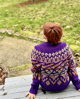 It is another round yoke stranded colourwork sweater, worked seamlessly from the top down, with the colourwork extending deeply past the sleeve separations. The design continues the theme of finding calm and creative flow through knitting colourwork, inspired by the art of Buddhist mandalas.
