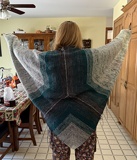 YPSILON is a huge triangle shawl which uses five colours in a fading order. It has build-in iCord edges and optional iCord-tails at all three ends.