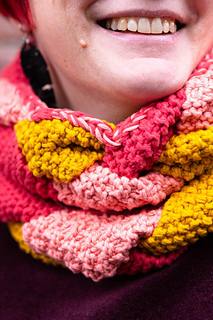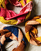 Aikuisen puuvillahuivissa on käytetty Dropsin Parisia (100 % puuvillaa, 75 m/50 g), sävy E: Vadelma (38), sävy F: Aprikoosi (01) ja sävy G: Sinappi (41).