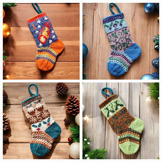 This pattern is for all 25 mini stranded stockings with hanging loops and garlands decorated with sprigs of holly leaves and berries. Each stocking is unique and has motifs inspired by the winter holidays and seasonal nature themes. The stranded colourwork includes numbers from 1-25 with a hanging loop to be used as an Advent Calendar. They make perfect gift wrap for small holiday gifts. They look good on a holidays card too. My neighbours are getting some with their house number on.