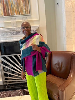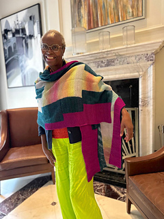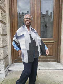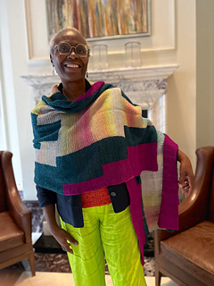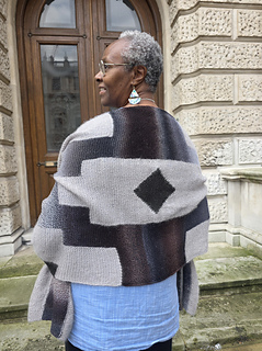 Zazi Wrap is a large colourful statement rectangular shawl / wrap, knit sideways using the intarsia colourwork technique knit in garter stitch following charts. The simple geometric pattern is easy to