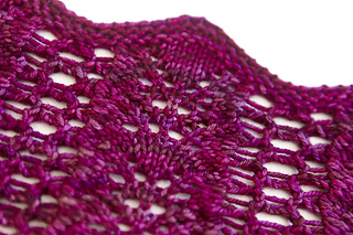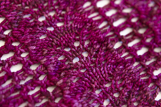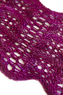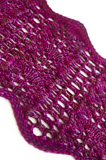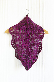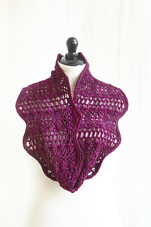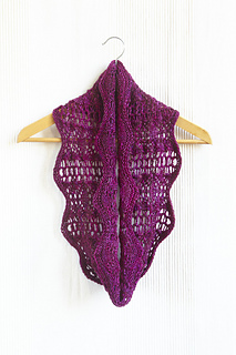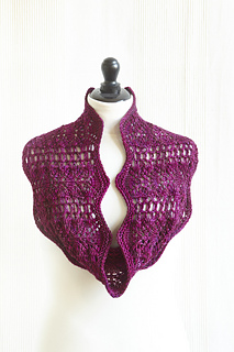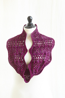 The Zerrélia cowl captures this interplay of organic forms and rhythmic structure. Fountain-like lace patterns rise like fern fronds, while columns of double yarn-overs create the airy transparency of glass walls. The rich magenta colorway echoes the deep hues of exotic blooms tucked among the greenery. Each stitch builds upon the last, architectural yet organic. Step into your own glass sanctuary, where light and lace intertwine.