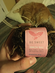 Mohair yarn with hand tied ribbon and spun with a thin metallic strand.