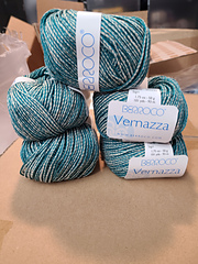 Vernazza’s unique construction wraps colorful viscose around a core of undyed cotton and linen. The result is a sophisticated yarn which can be worked at a larger gauge for a relaxed fabric or more tightly for structured pieces.