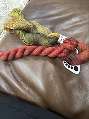 Two separate hanks together. 300 yards of multi, 100 yards of solid. Designed to be knit with the solid as the heel and toe of socks.