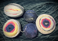 This contrasting energetic yarn has a delightful color range of seven to nine shades within one cake! Knit or crochet beautiful vibrant scarves or shawls in this light weight yarn.