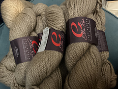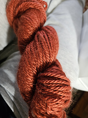 70% Acrylic, 30% Baby Alpaca with approx 120 yards per 100g that knits to 3.5 sts per inch on a US 10.0 needle.