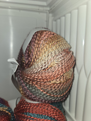 100% Polyester with approx 262 yards per 100g that knits to 5.5 sts per inch on a US 7.0 needle. Packaged as skeins.