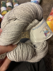 This yarn is a blend of superwash merino and lurex, a silvery sparkly yarn. This is a great yarn for people who love sparkles. The metal is silver in color and is plied well so it stays within the yarn and doesn’t worm out. Unlike other sparkly yarns, the lurex is actually soft and not irritating to your skin. This is suitable for shawls, scarves and of course, socks.