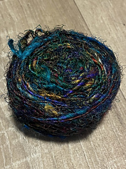 This yarn is handspun from reprocessed woven silk saris. Yardage & weight vary. There are no dyelots, each skein is unique. Please adjust your yardage and weight at stash level.