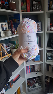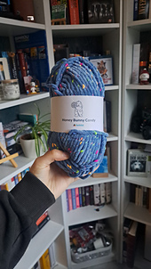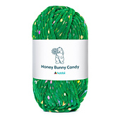 Honey Bunny Candy is a super bulky velour yarn made out of 85% polyester and 15% polyamide. The chenille’s silky and smooth texture has now gotten a sprinkle of rainbow neon flecks running around the main polyester thread.
