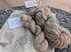 Our Cast Away yarn comes in a gorgeous range of hand carded and handspun colors. In some colorways over 10 fibers colors are all tediously carded together. The finished result is a beautiful melange of colors in a super soft thick and thin textured yarn.