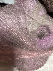 Soft Mohair fiber is brushed with natural silk and spun into a loop boucle and secured at the base.