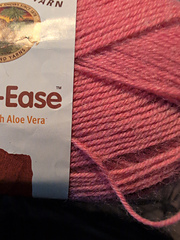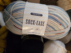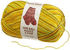 From LionBrand.com: “A traditional fingering-weight sock yarn designed to produce flowing color patterns in a sophisticated palette. Great for socks, scarves and other accessories, [the new] Sock-Ease is finished with aloe vera to soften your hands as you knit or crochet.”