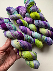This 4-ply yarn is hand-painted with professional acid dyes. It’s soft and will create a firmer fabric when knit when smaller needles.