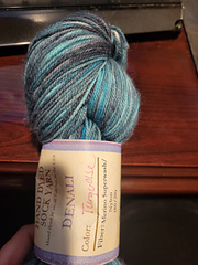 Description from the website: Take away the bamboo, add a little more nylon and superwash treatment, and you’ve got our Denali sock yarn. It is a little denser than the Yukon but is still very soft and lofty in its own right. Colorways tend to be a little less muted than the Yukon. For those traditionalists that are suspicious of bamboo as a yarn ingredient, Denali is a perfect replacement. Like our other sock yarns our 450-yard skeins give you plenty of length for a full pair of socks. Denali is washable (hand wash or machine wash gentle cycle.)