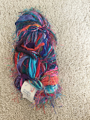 Exuberant eyelash, metallic, and highly textured yarns, as well as torn strips of dyed silk fabric.