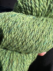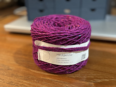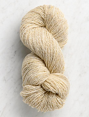 Hedgerow is a two-ply woolen-spun yarn. Woolen-spun yarns are made directly from carded fiber, which creates a bit of a “fuzzy” finish compared to worsted-spun yarns, which are combed first to align all the fibers for a smoother, denser yarn. Another difference is that woolen-spun yarns trap more air, making them lighter, loftier, and warmer than worsted-spun yarns. Woolen-spun yarns also tend to be very elastic and bouncy and, like Hedgerow, bloom beautifully after washing.