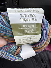 60% Cotton, 40% Acrylic with approx 190 yards per 100g that knits to 4.5 sts per inch on a US 8.0 needle.
