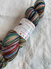 This base is a soft blend of Superwash Merino and Nylon. The added nylon adds a great deal of strength without compromising softness. I can see a wide variety of projects coming from this yarn, cardigans, baby items, socks, hats, mittens. The list goes on and on. This yarn is machine washable though I recommend hand washing most hand knits.