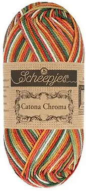 Scheepjes Catona Chroma is a brand-new, multicoloured variation on our popular 100% Mercerised Cotton yarn Scheepjes Catona! Both yarns are identical in fibre content and quality, which makes them ideal to mix and match to give your projects a playful pop of colour, especially as all eight colourways of Catona Chroma are made up of existing shades of the Catona range.