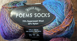 Poems Sock is a 75% wool / 25% nylon roving sock yarn featuring beautiful shades which blend easily from one color to the next. Available in bright, medium, and somber shades, Poems Sock is not just for socks --- try it for mittens, hats, and lace projects too!